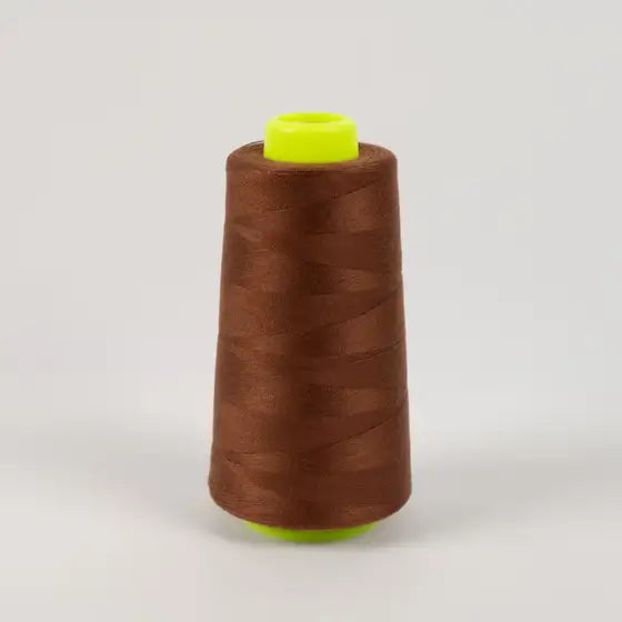 Fil surjeteuse 100 % polyester teint en masse, coloris marron glacé — pour des surjets durables et impeccables.