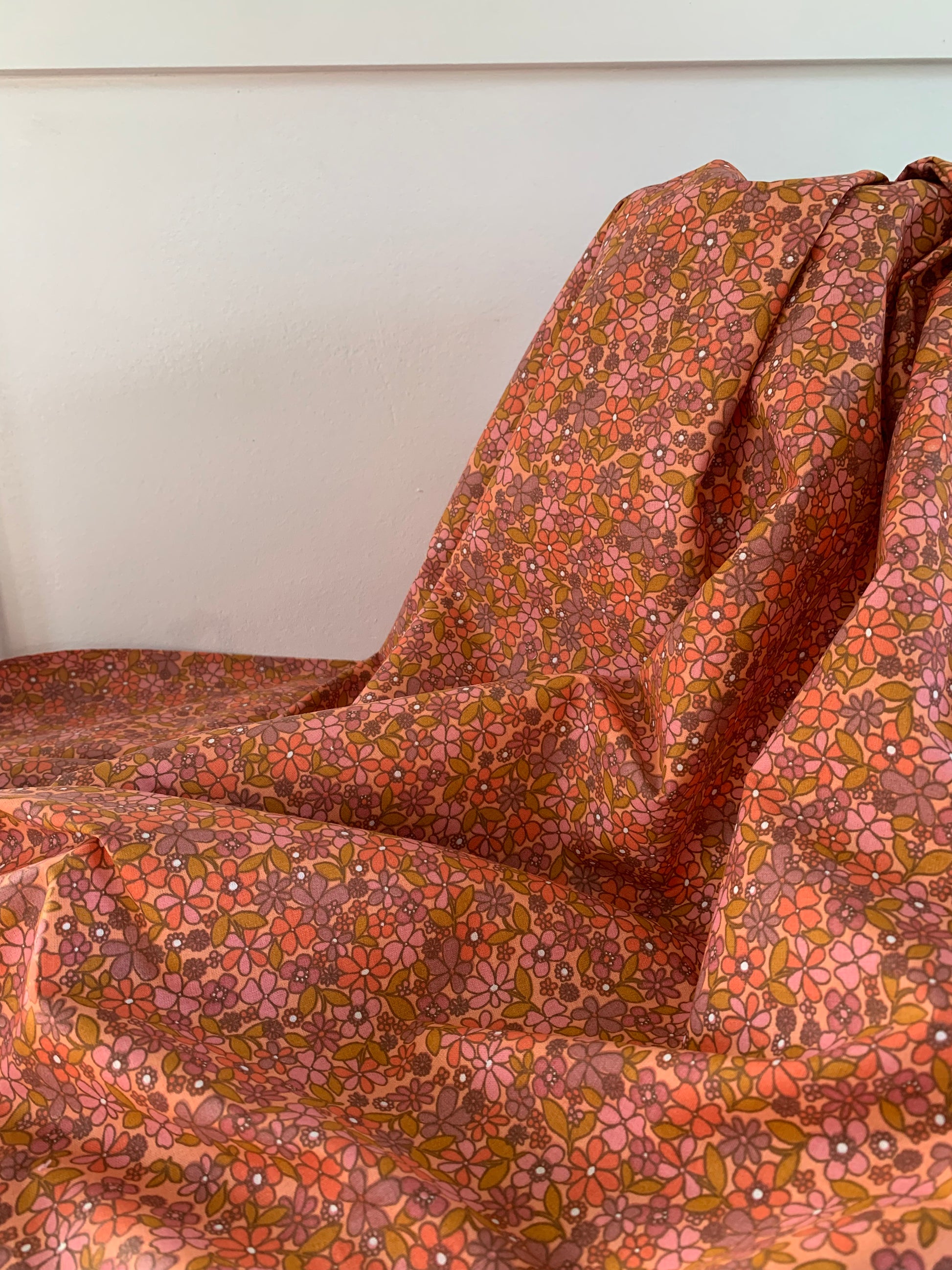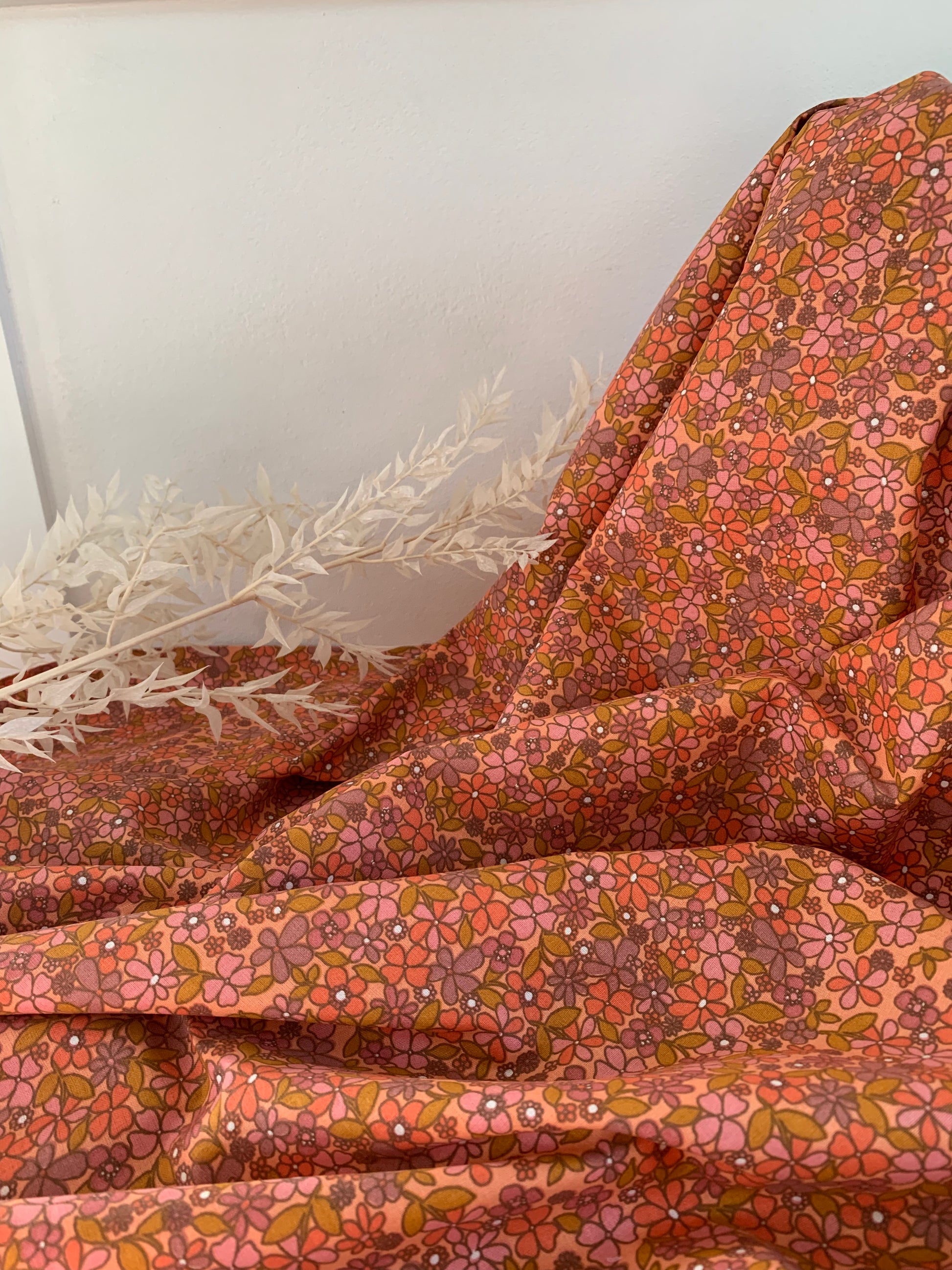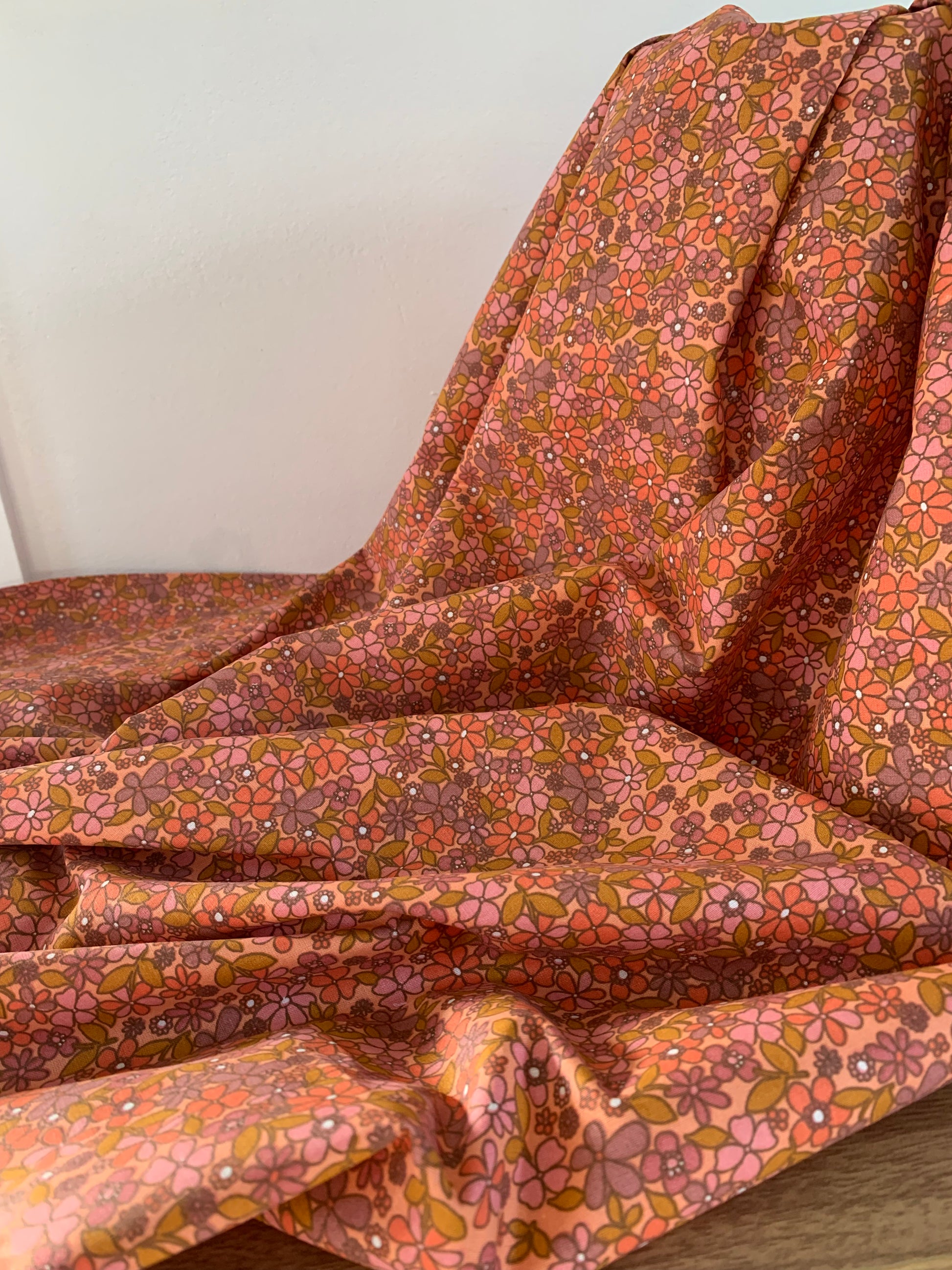 Un imprimé pêche et rose, frais et délicat : parfait pour blouses, chemisiers, robes fluides, jupes légères et accessoires (chouchous, foulards, housses de coussin).