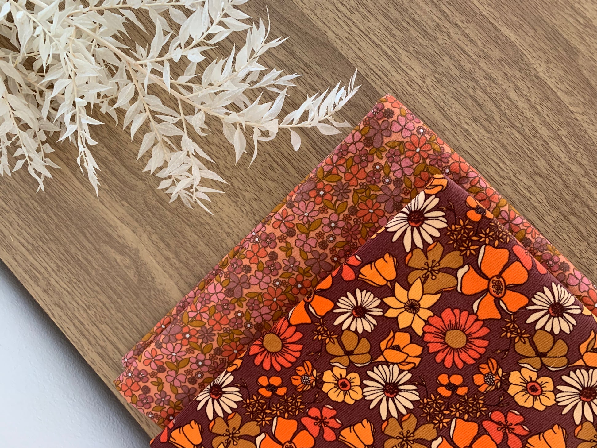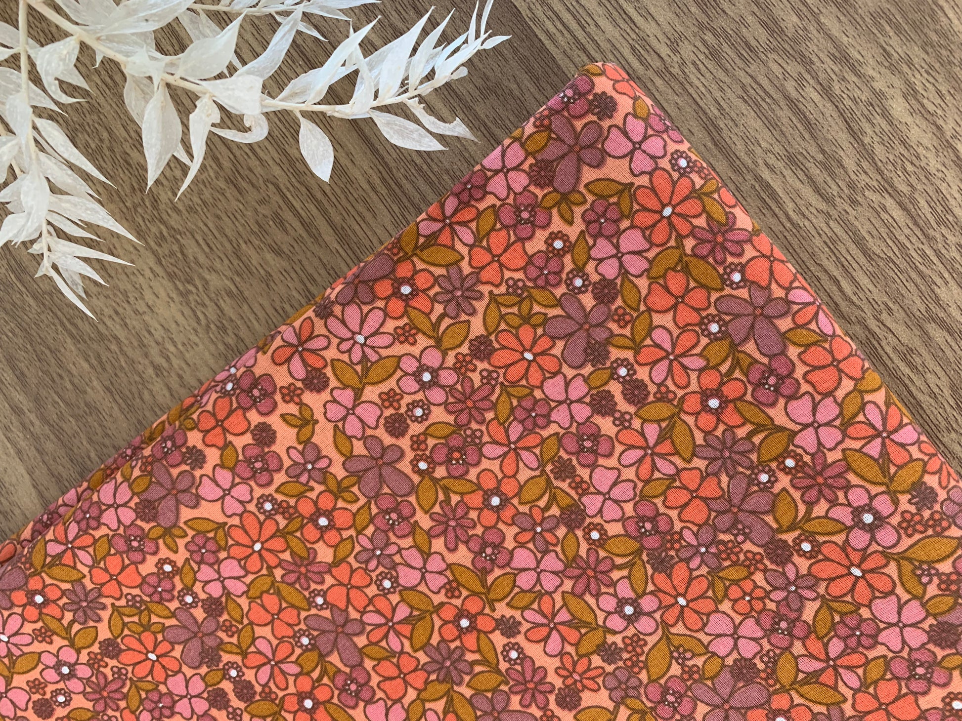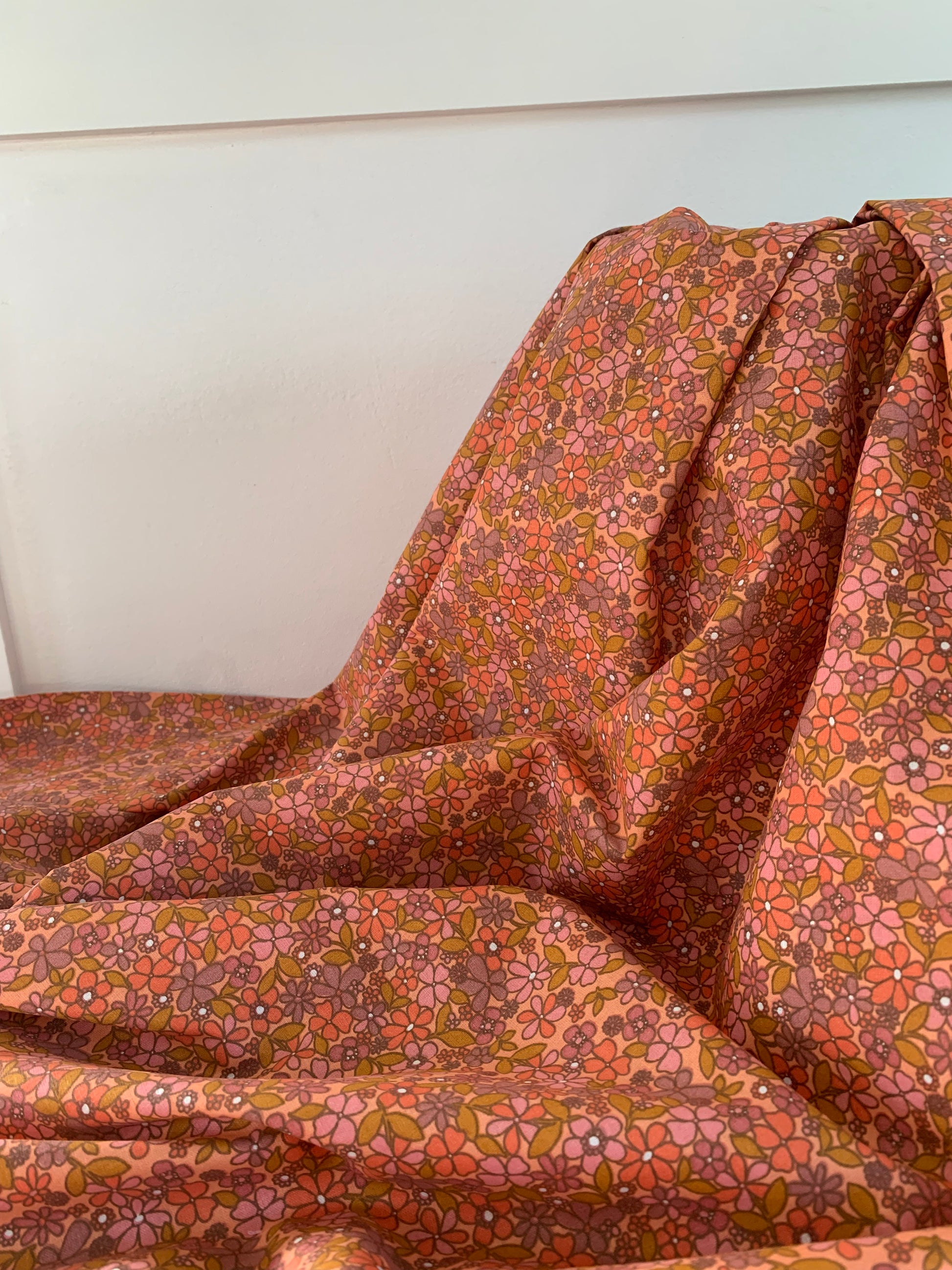 Un imprimé pêche et rose, frais et délicat : parfait pour blouses, chemisiers, robes fluides, jupes légères et accessoires (chouchous, foulards, housses de coussin).