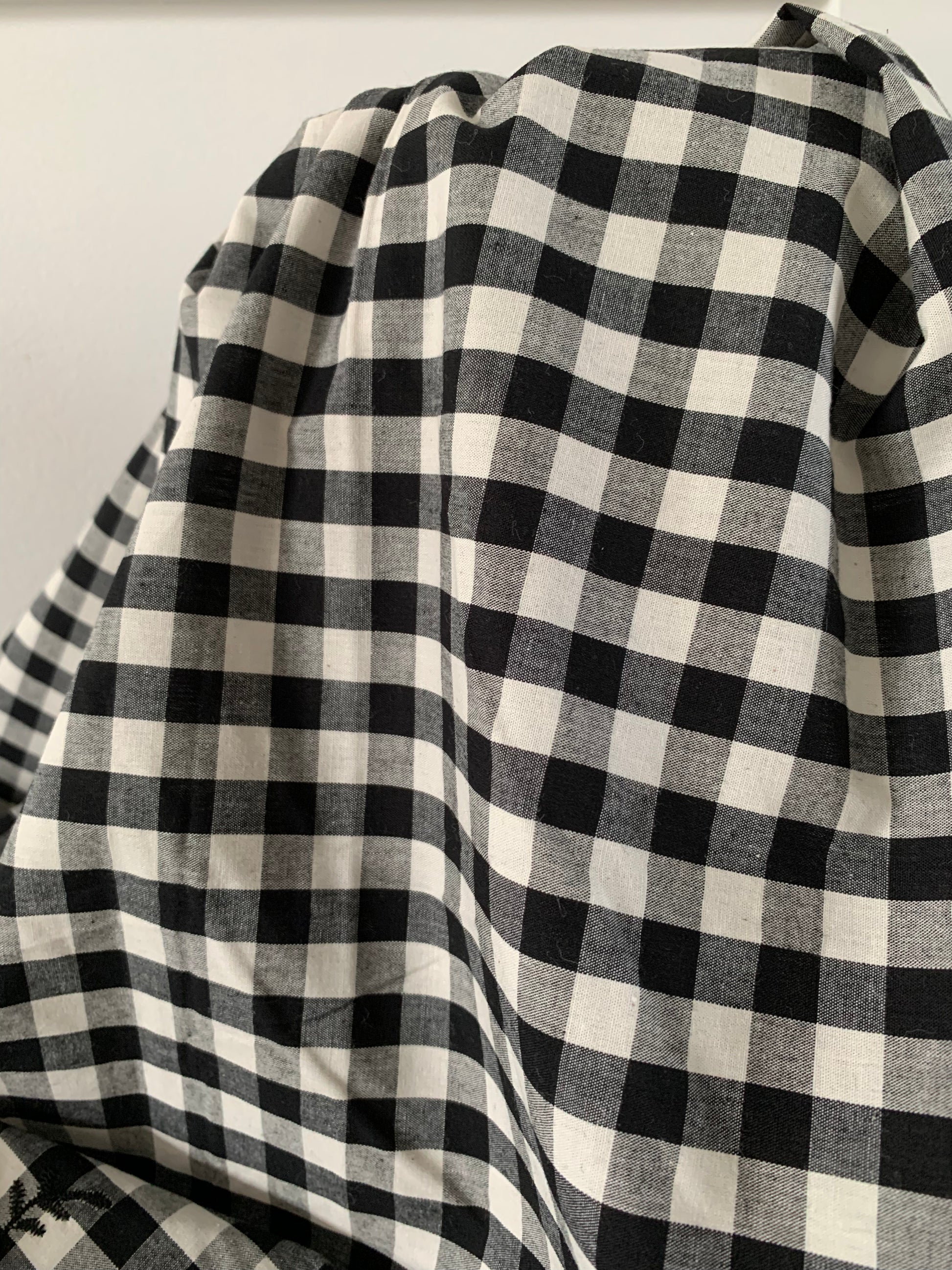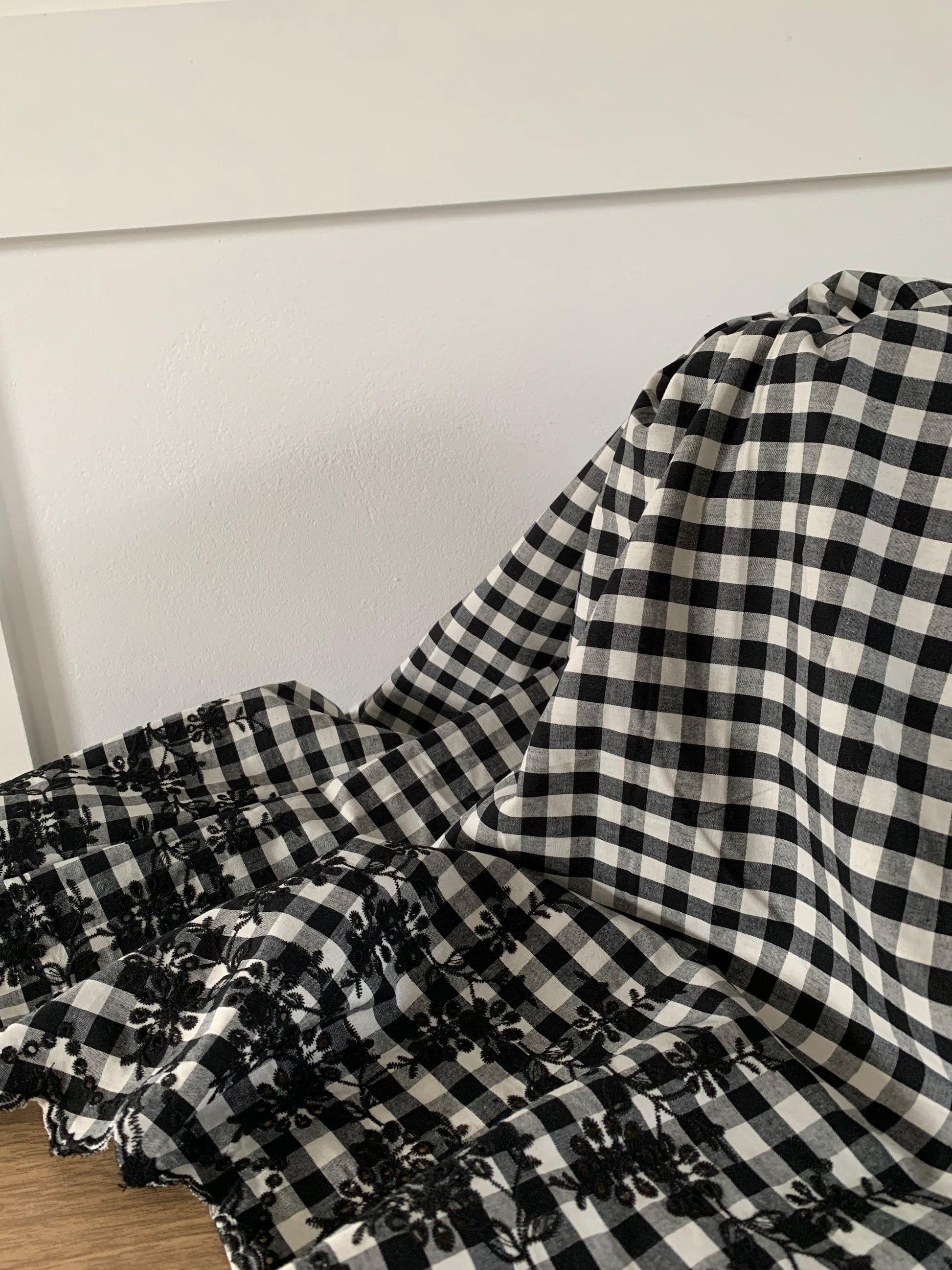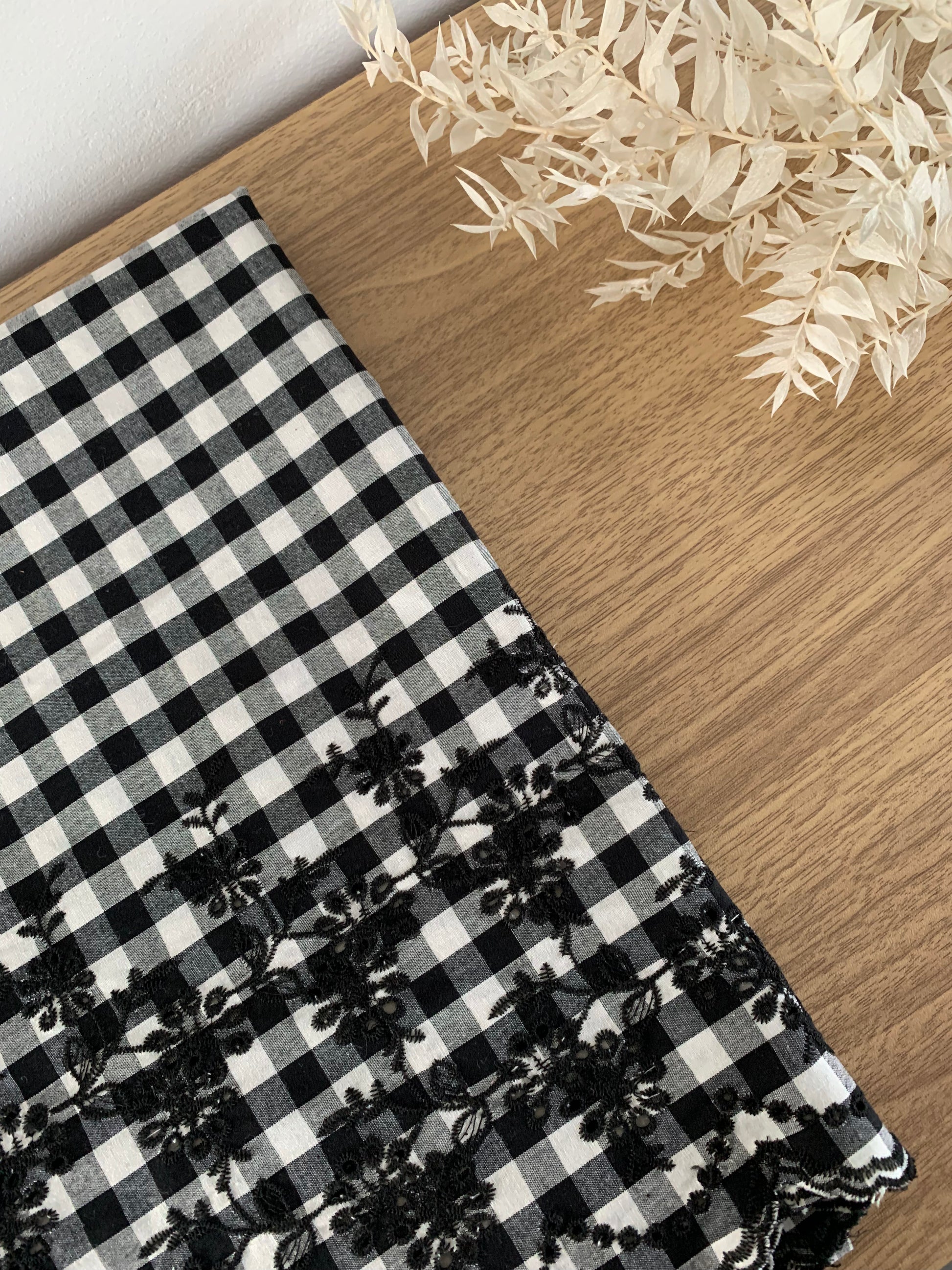 Ce coton à motifs classiques noir & blanc avec bord festonné apporte une touche graphique subtile : idéal pour des robes légères, chemisiers, accessoires déco comme napperons ou coussins, ou pour décliner un duo élégant linge de maison + vêtements.