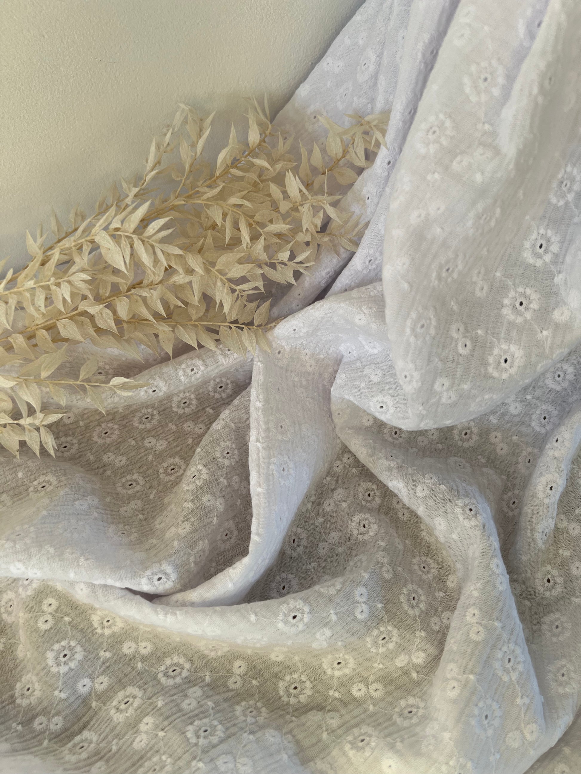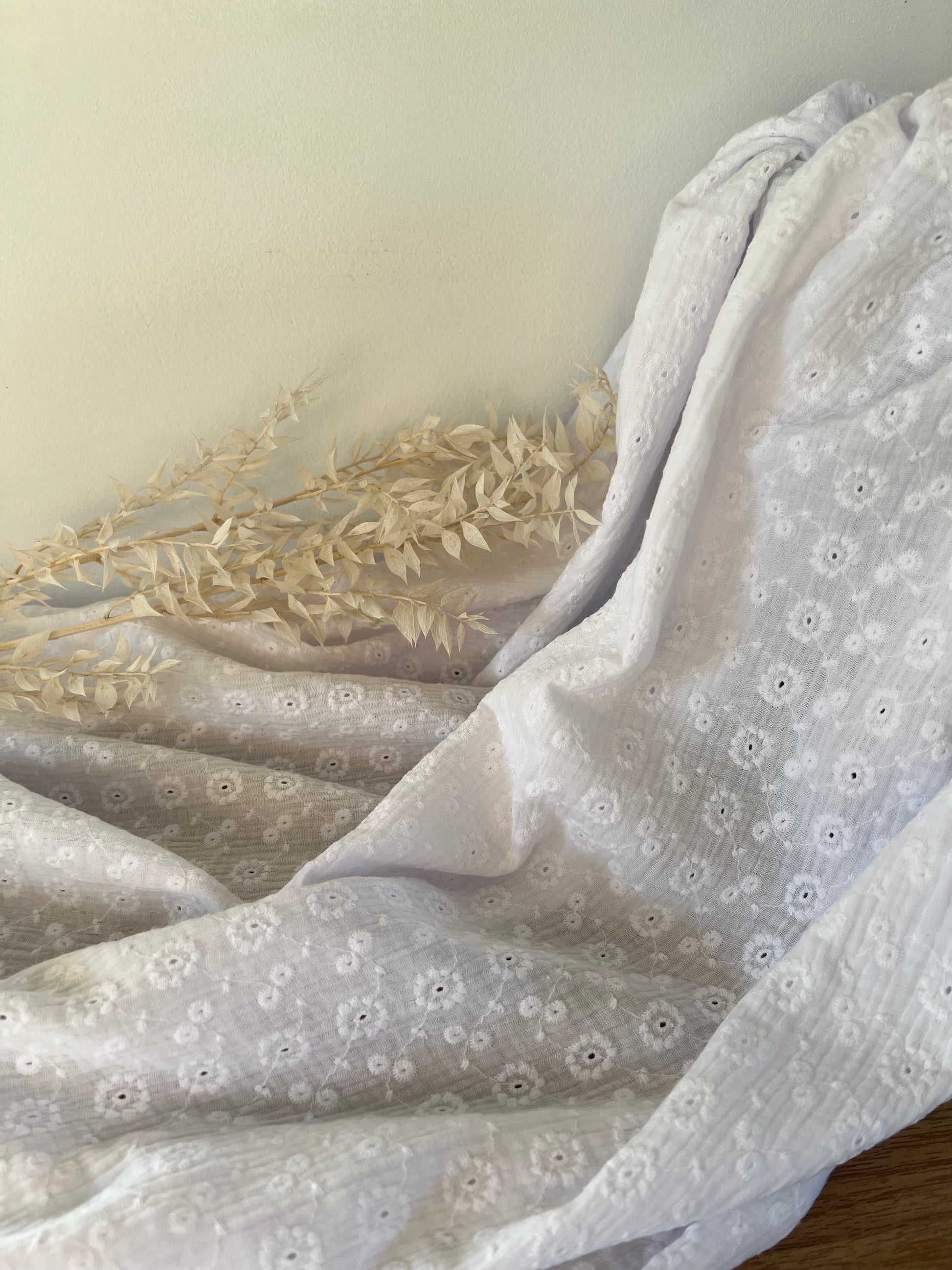 Cette double gaze brodée blanche est une ode à la douceur et à la légèreté. Ses broderies délicates ajoutent un charme intemporel, parfait pour réaliser des blouses raffinées, des robes aériennes ou du linge de maison élégant. Une matière idéale pour des créations estivales et poétiques.