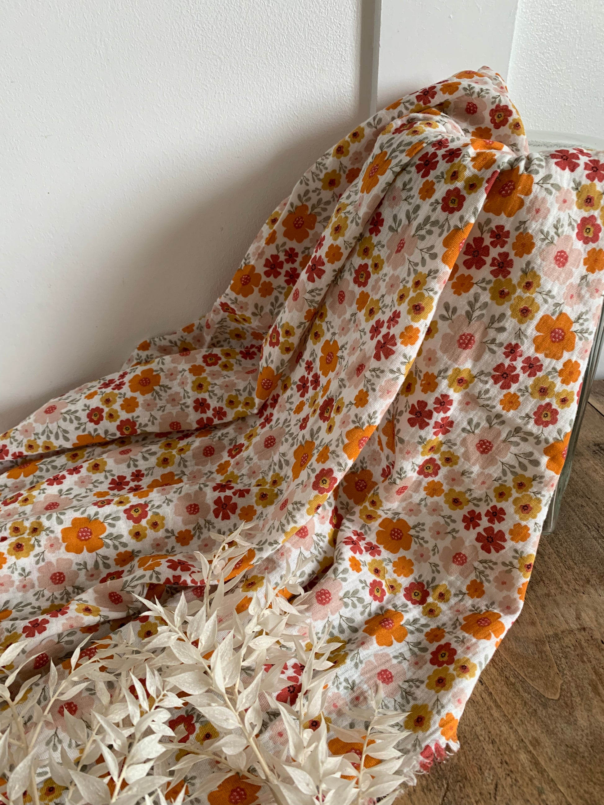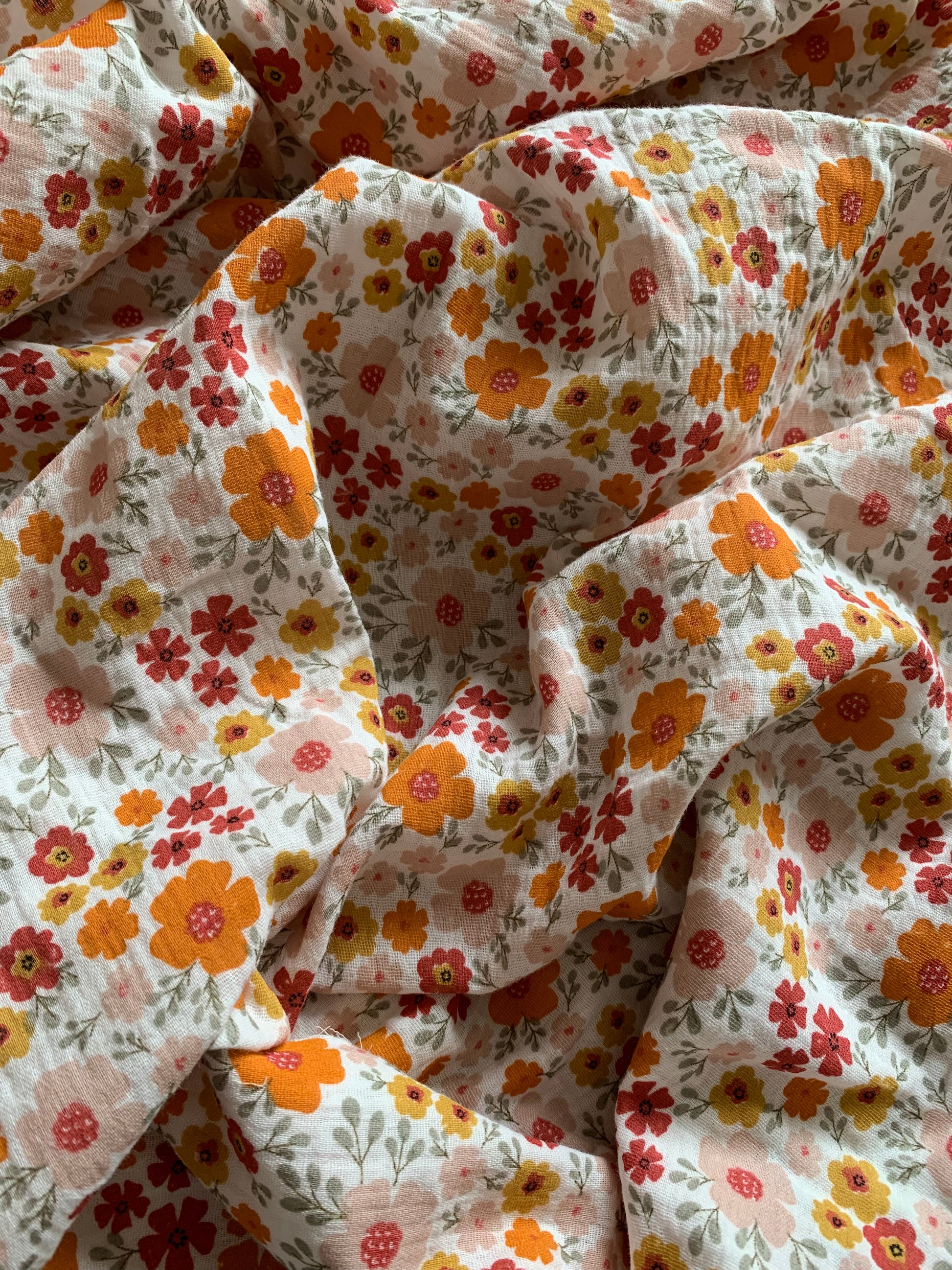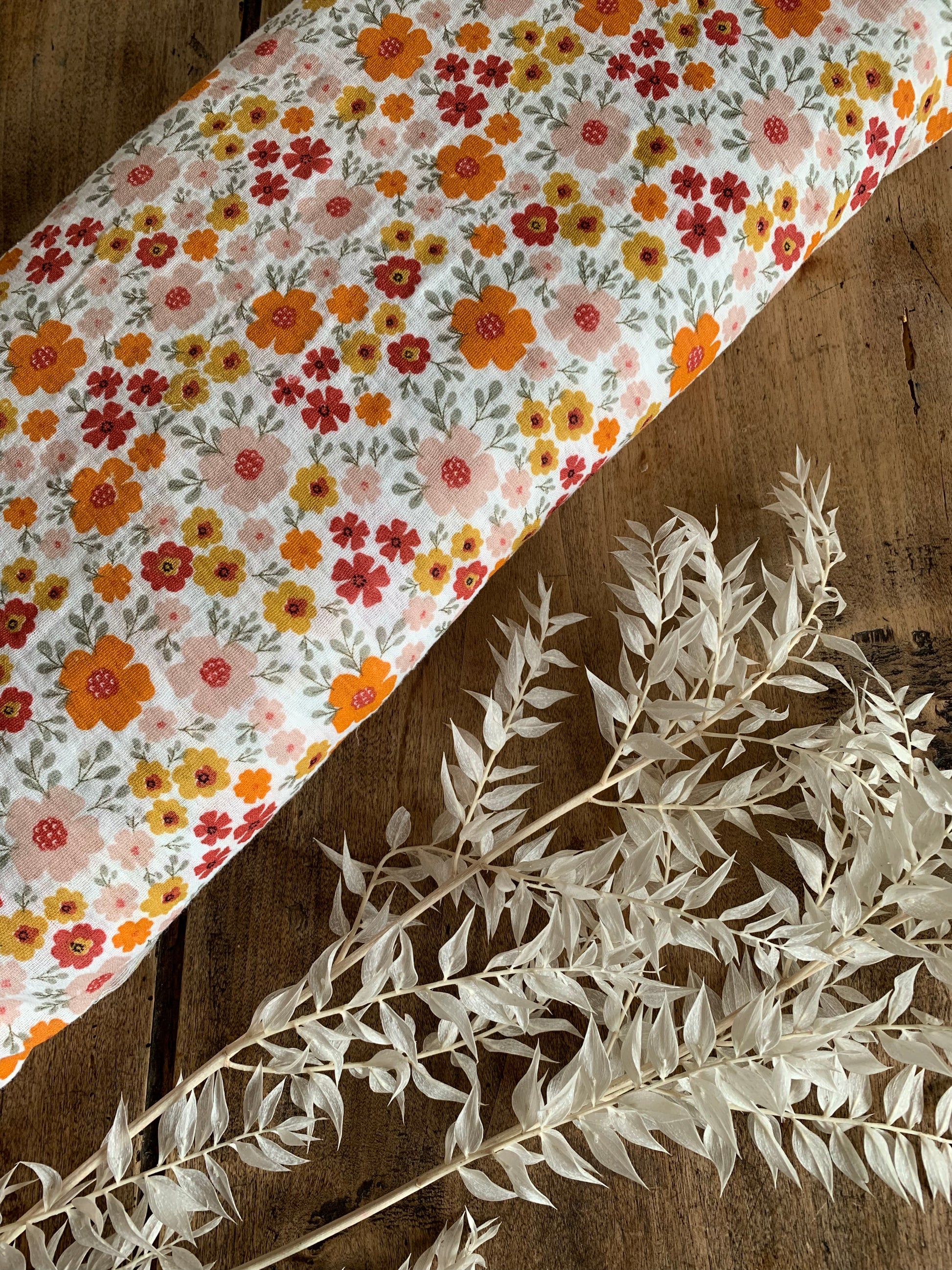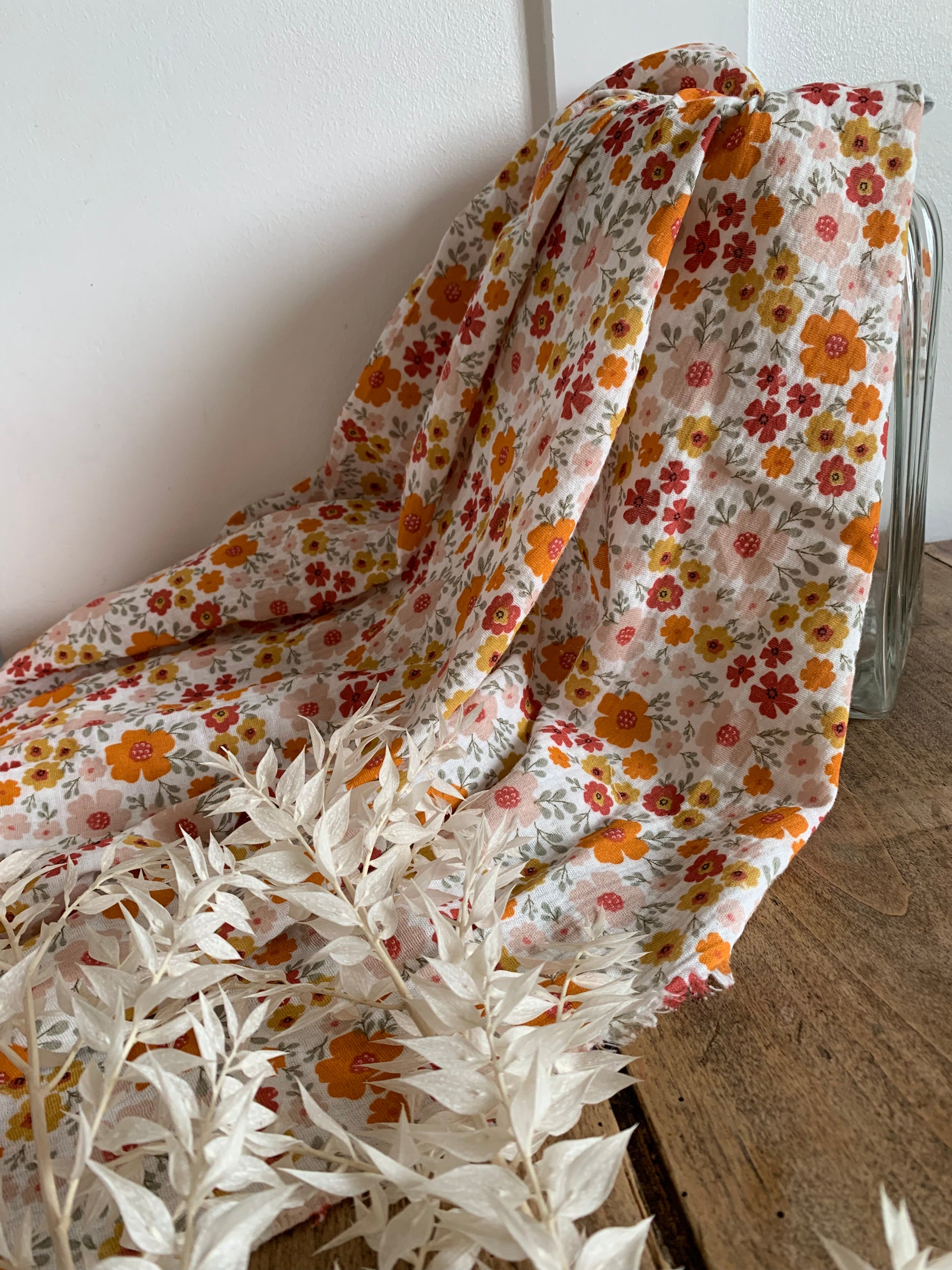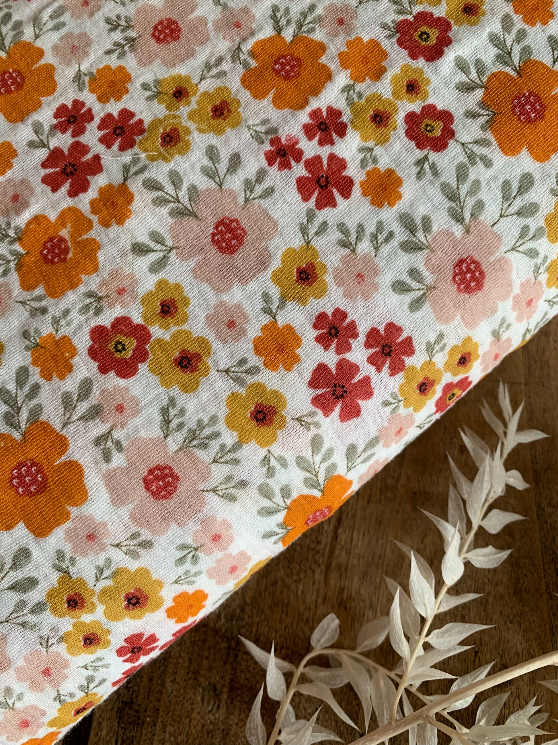 Une double regard écru parsemée de fleurs fines : légère, douce et aérienne. Parfait pour des chemisiers bohèmes, robes d'été, accessoires bébé ou foulards au charme naturel.