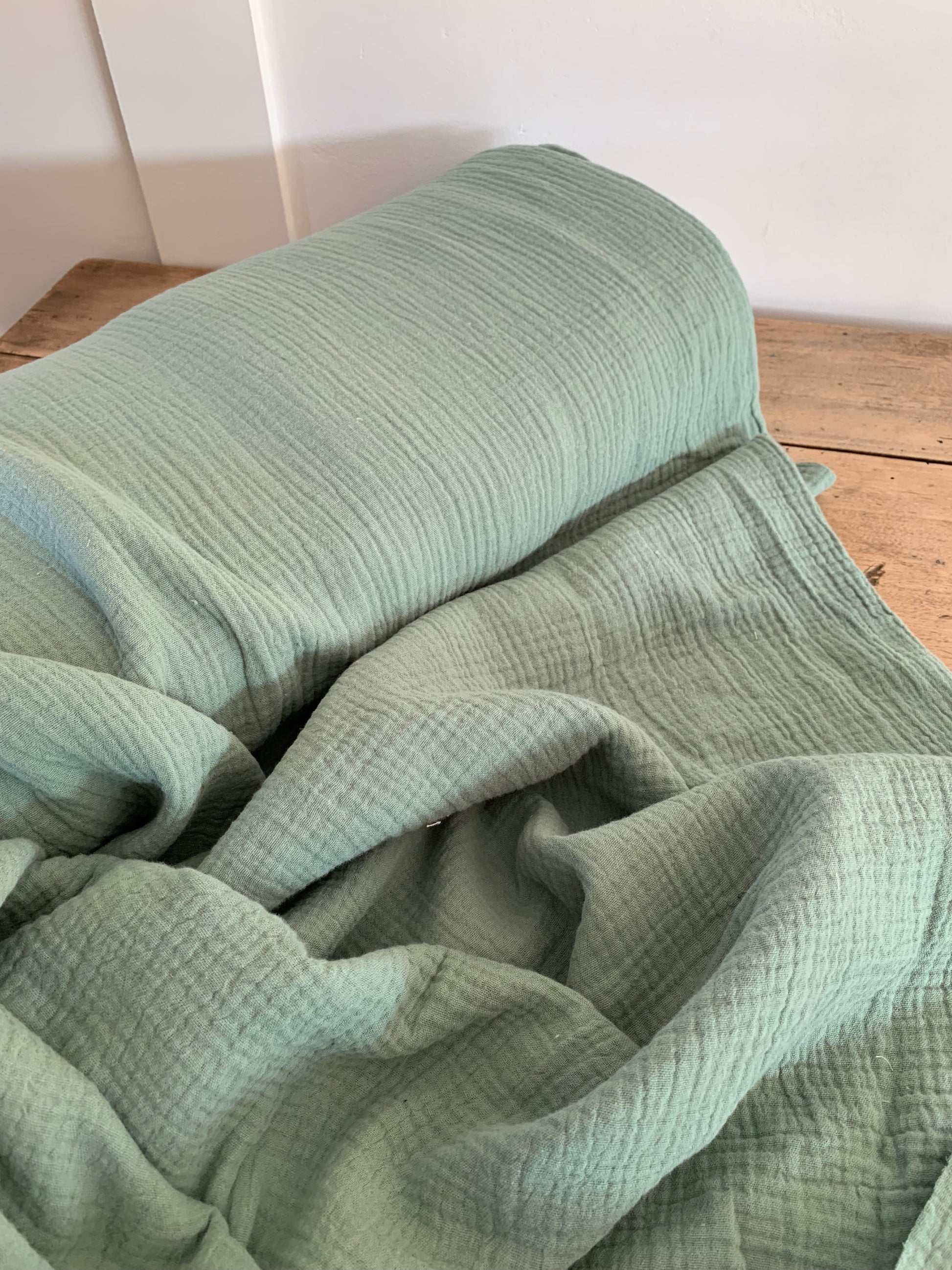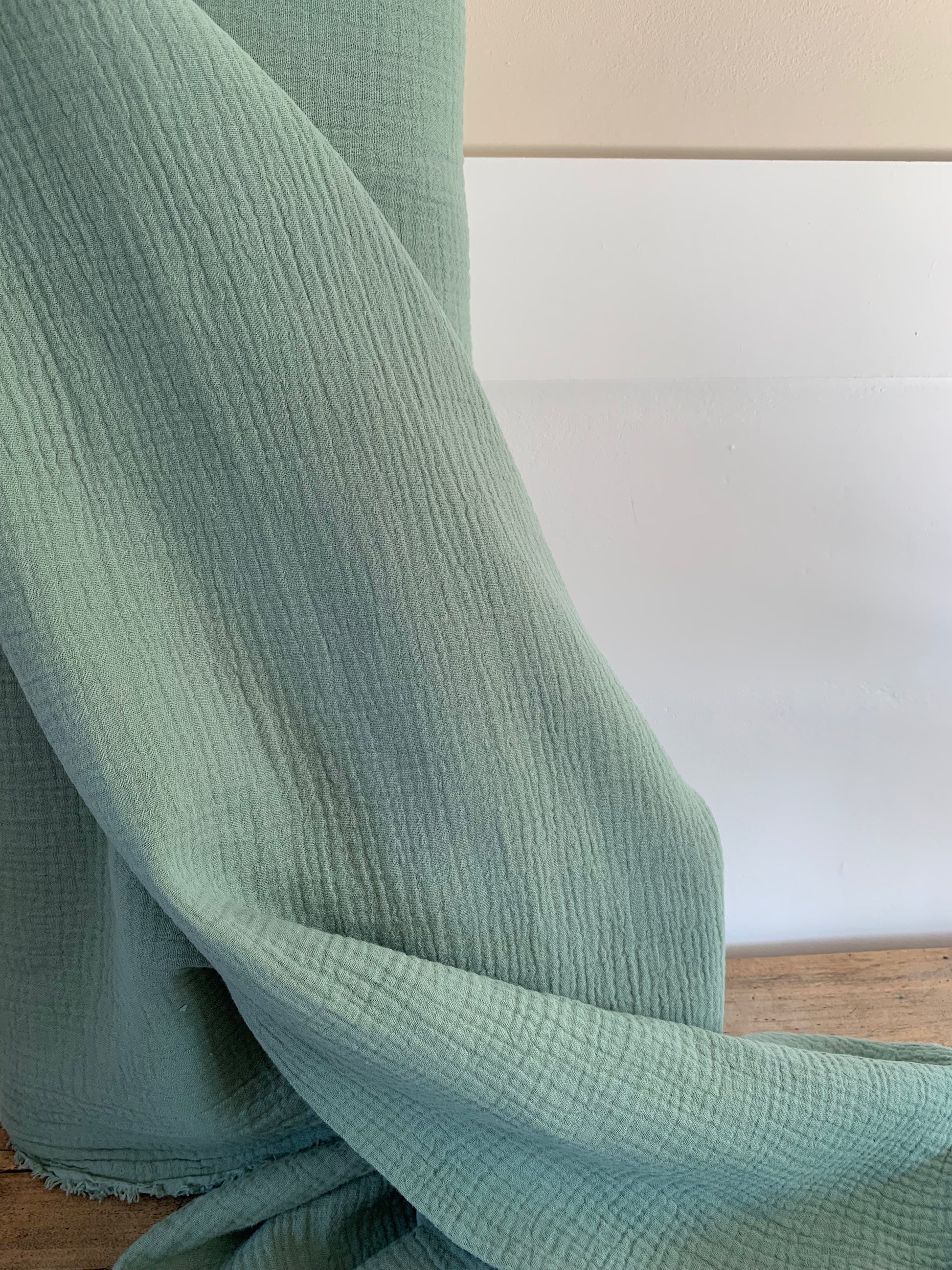 Cette double gaze menthe foncée apporte fraîcheur et légèreté à vos créations. Idéale pour des projets textiles délicats et naturels.