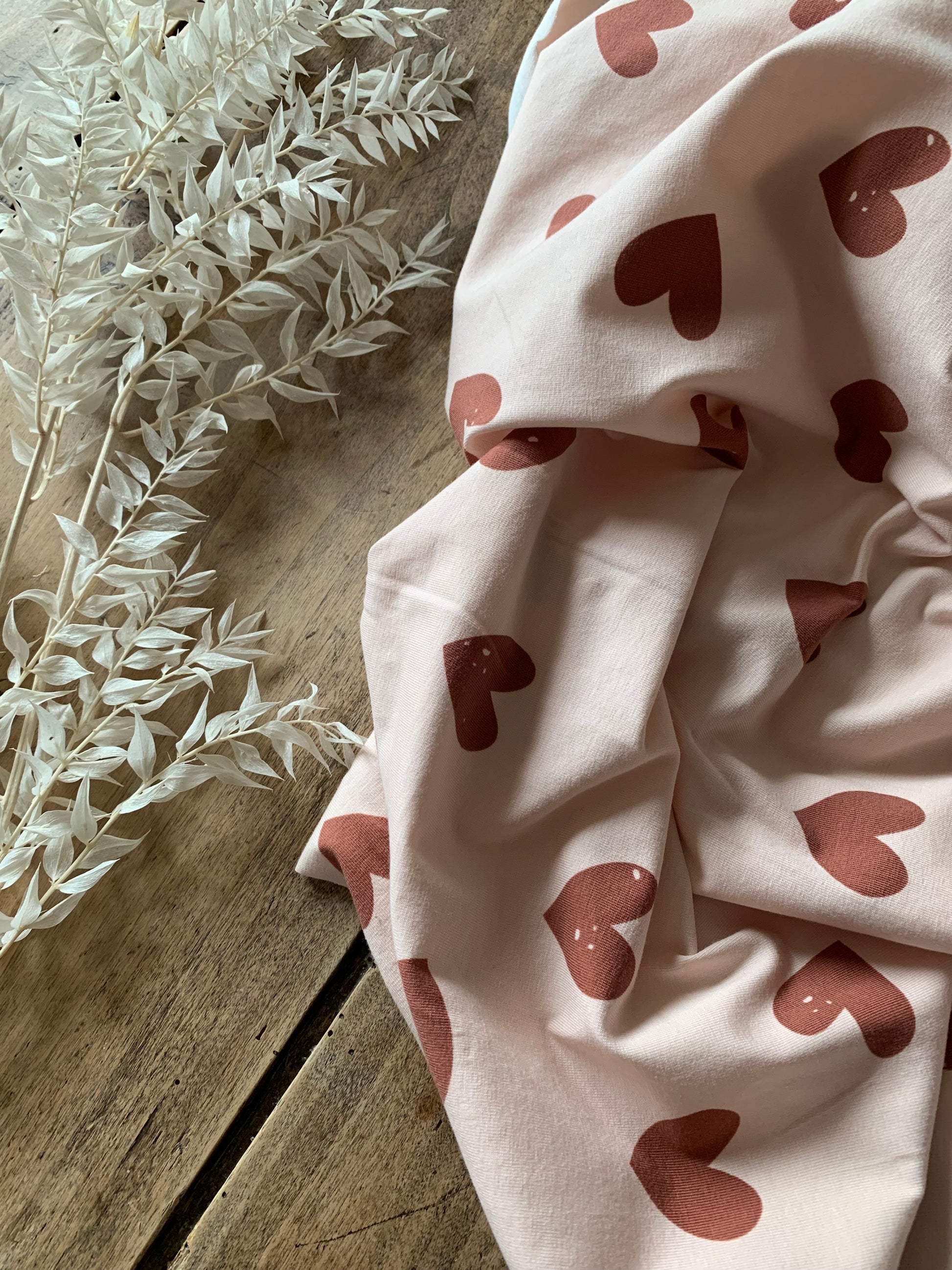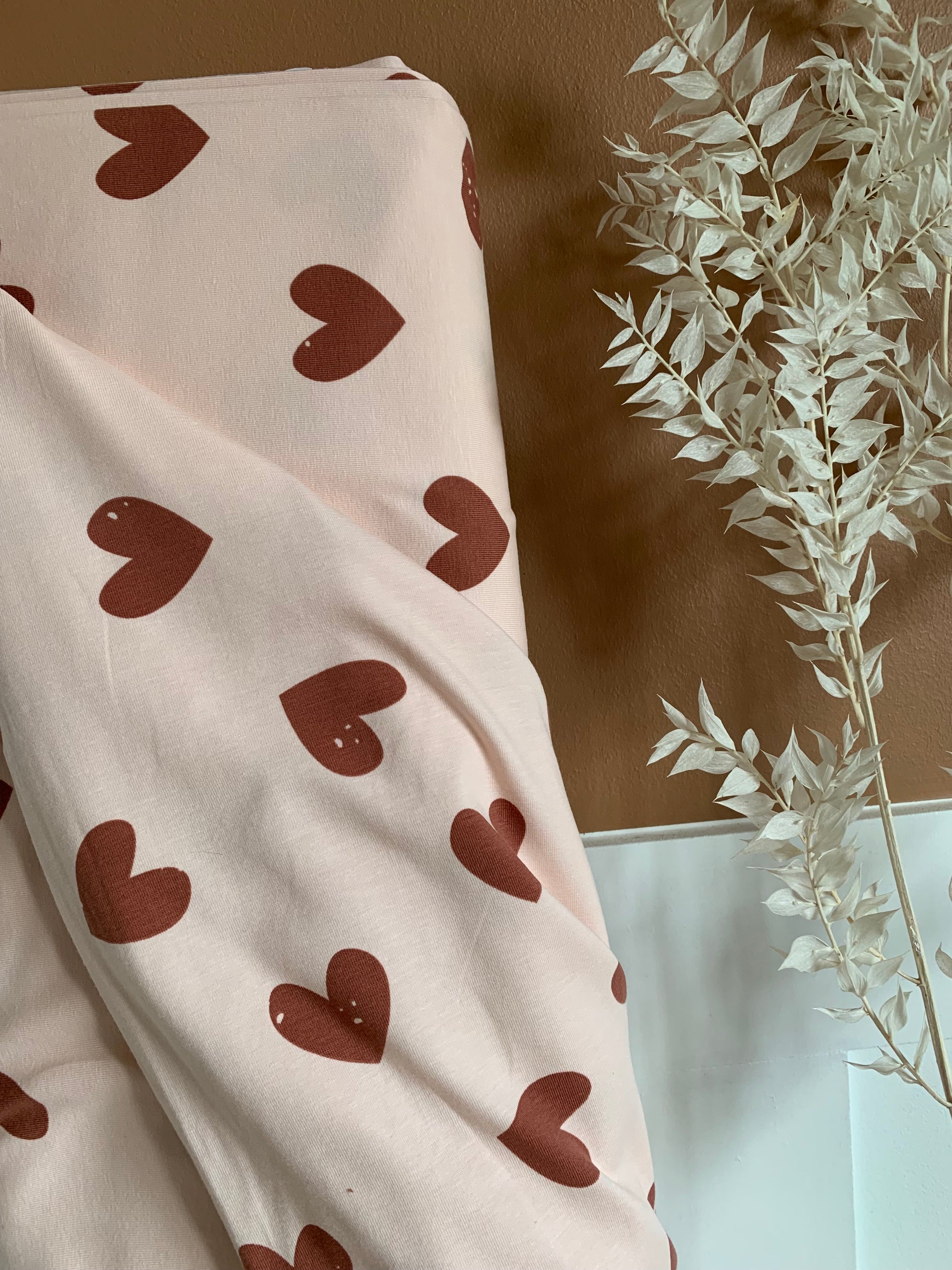 Un jersey tout en tendresse, parfait pour coudre des vêtements confortables et adorables pour enfants ou bébés : pyjamas, bodies, leggings, t-shirts ou bonnets doux à croquer. Son vieux rose intemporel et ses petits cœurs délicats en font un incontournable de la garde-robe cousue main.