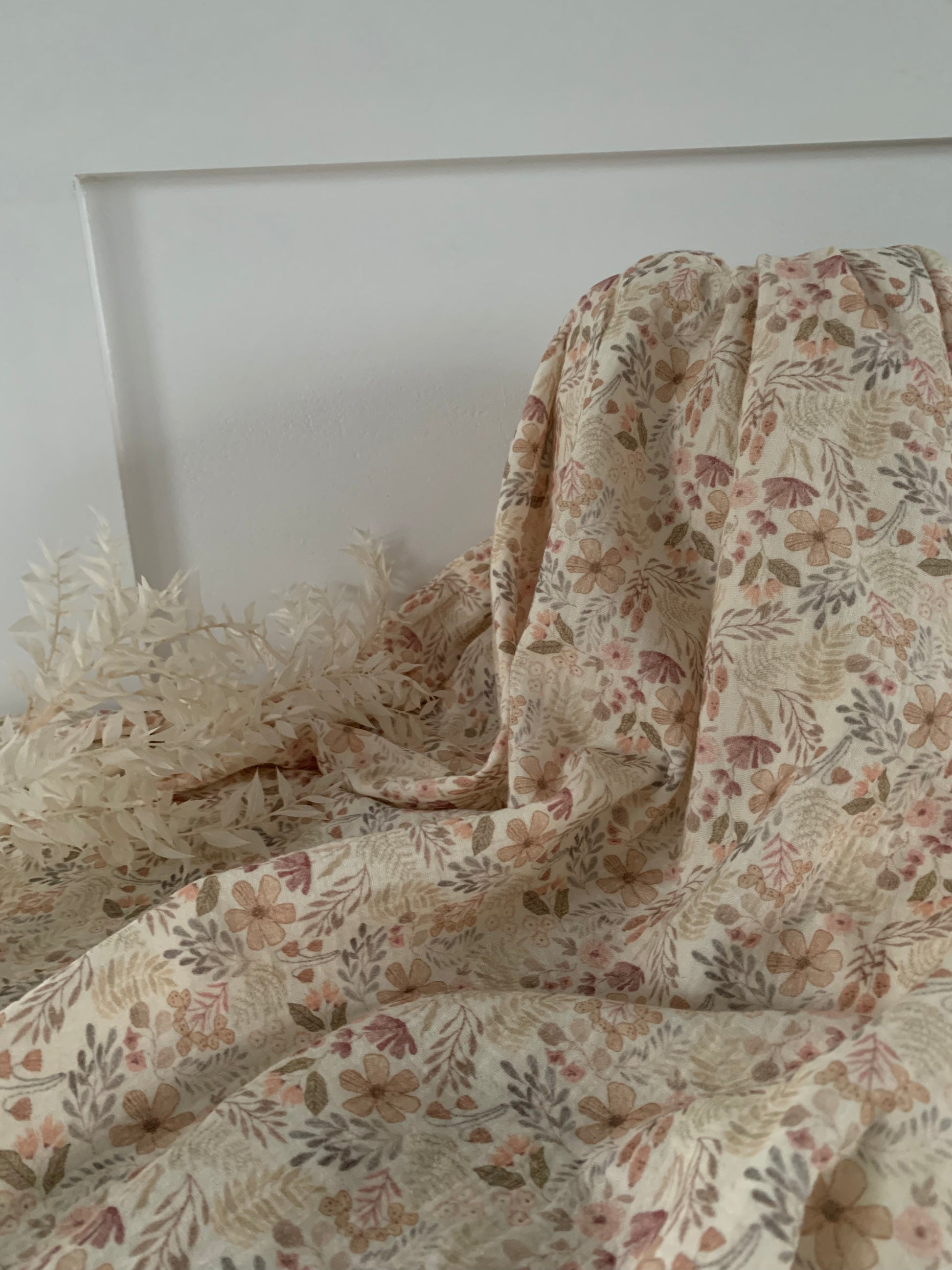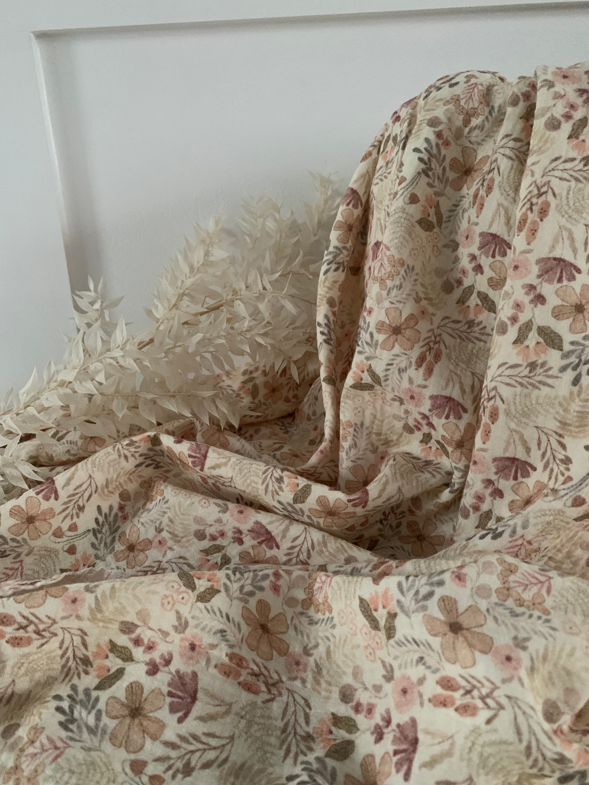 Ce double regard délicat mêlant floraison vintage et tonalité beige douce évoque une esthétique romantique et apaisante. Idéale pour réaliser des vêtements fluides pour bébés (draps, bodys, couvertures), des robes d'été légères, des accessoires bohèmes comme des foulards ou châles, ou encore des articles déco comme des coussins cocooning.