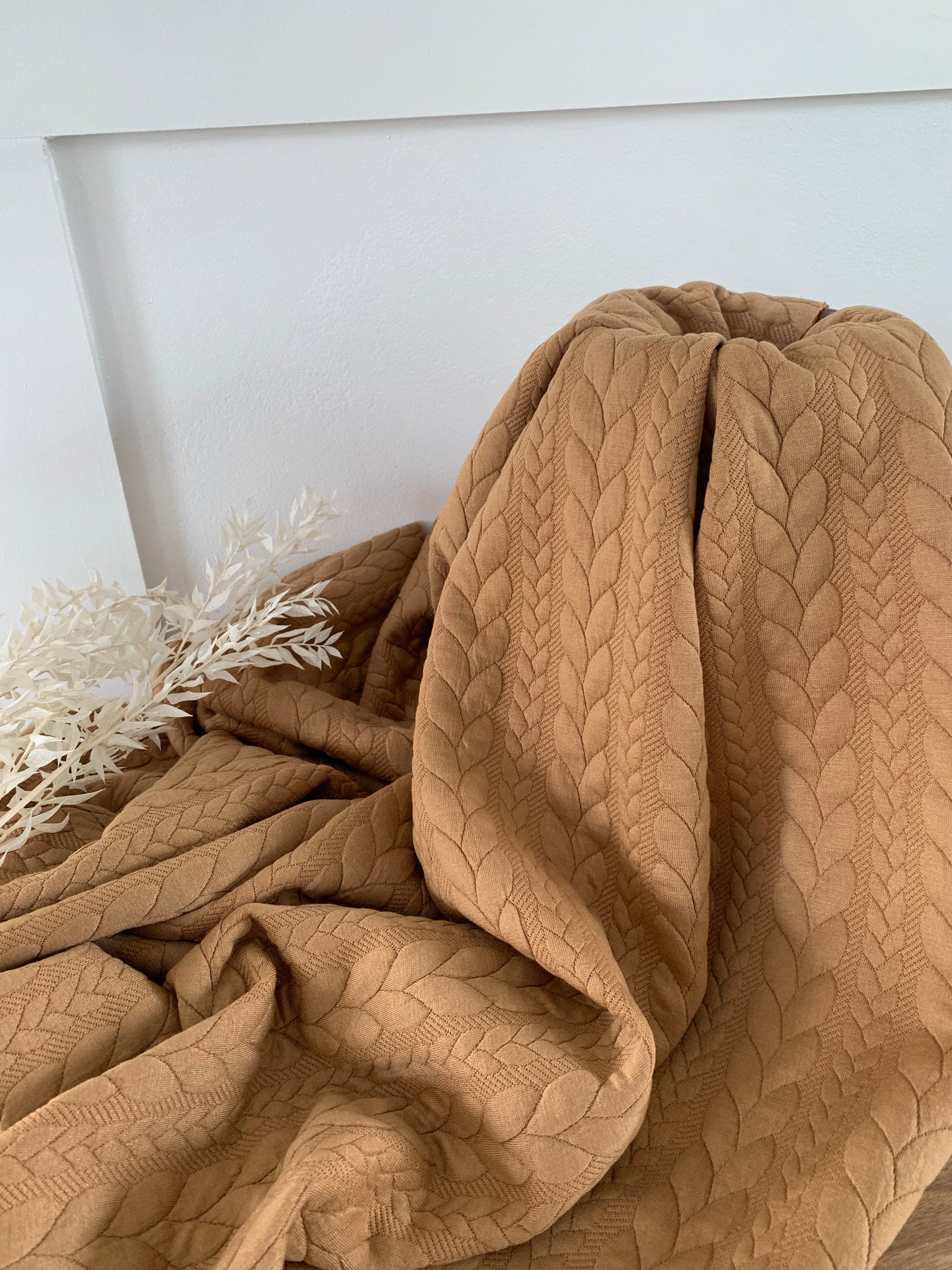 Ce jersey jacquard tricoté avec motifs torsadés dans un ton chameau chaleureux évoque élégance et confort. Idéal pour des cardigans enveloppants, pulls douillets, accessoires cocooning ou coussins chics.